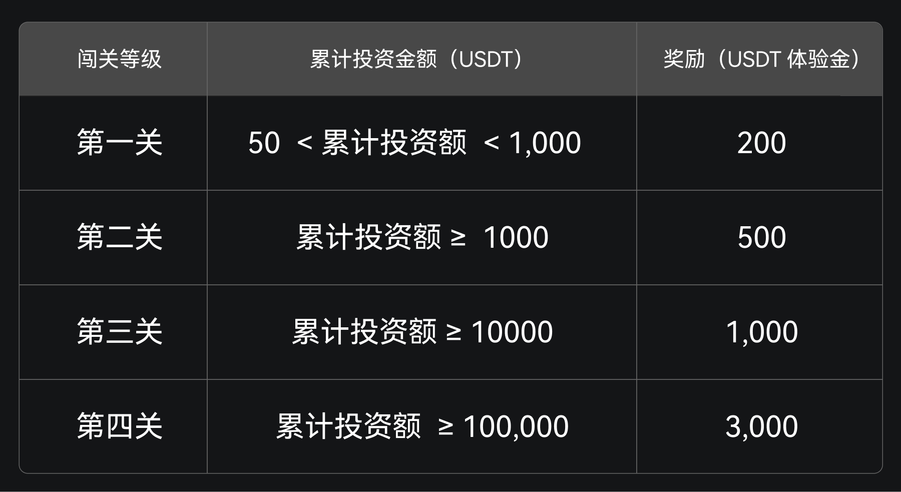 在活动期间,用户的双币投资总额达到以下档位,即可获得相应的奖励: