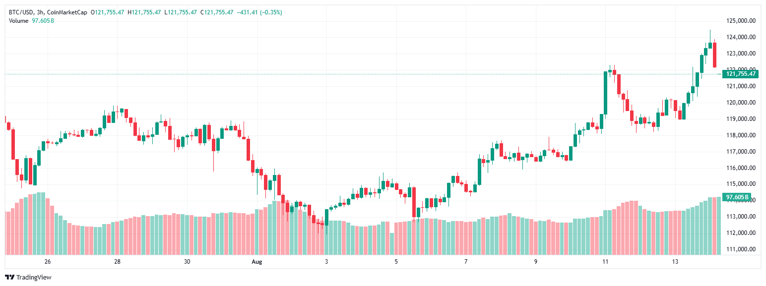 截至撰写本文时,比特币的价格已达到121,853美元,日内上涨2.1%,将加密市场的总市值推高至创纪录的4.19万亿美元。