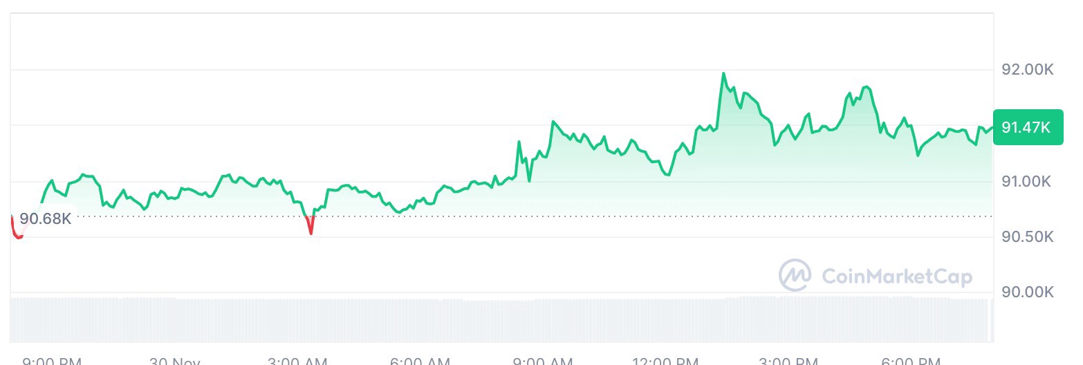 加密货币市场呈现震荡走势。截至2025年12月1日凌晨5时12分,比特币(BTC)较前一天上涨了+0.86%,现交易价格为91,467.60美元(约合1亿3,423万元)。