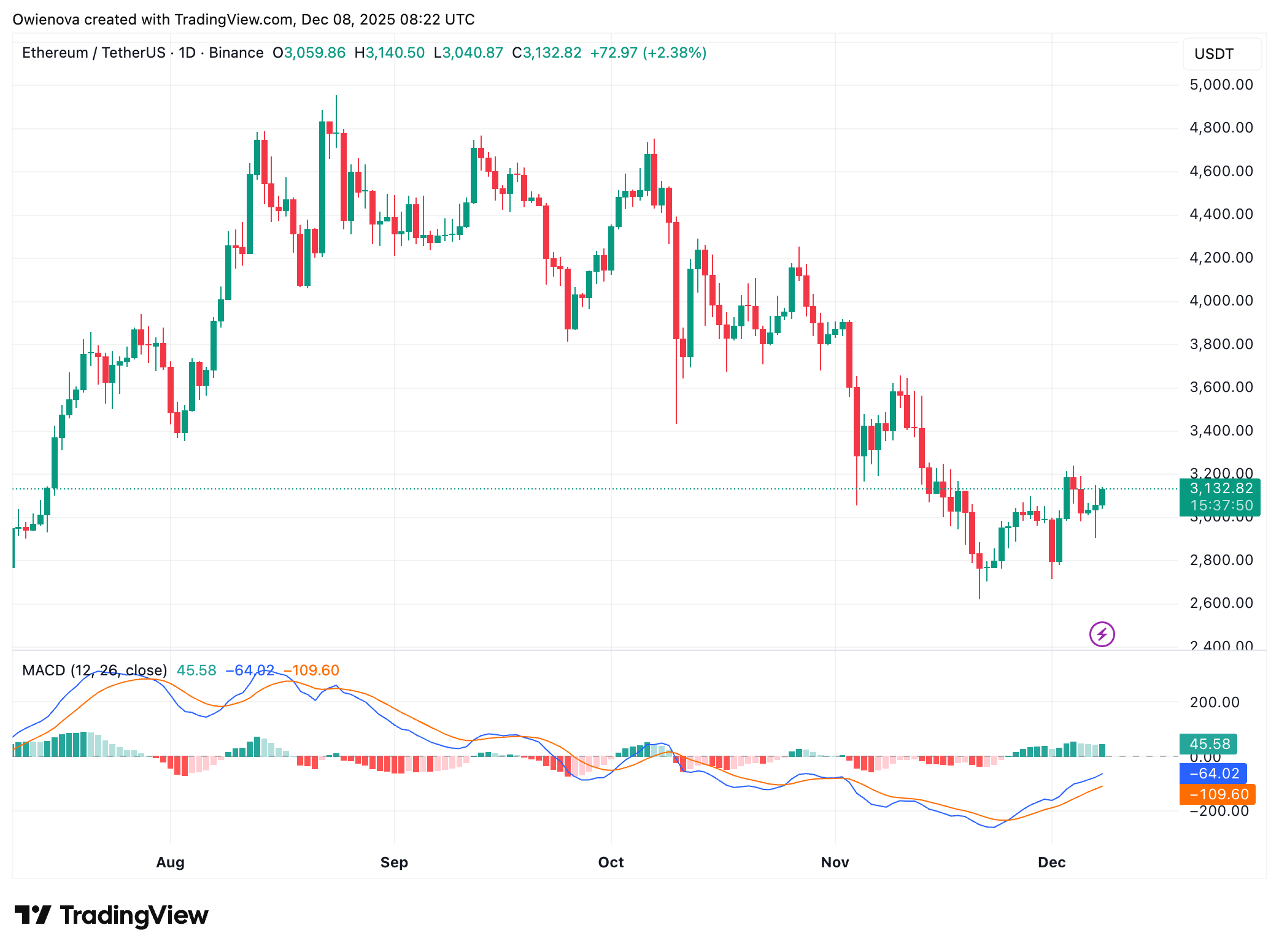 !Ethereum以太坊在1D图表上交易价为3,132美元 |来源:Tradingview.com 上的ETHUSDT 图来自Freepik,图表来自 Tradingview.com